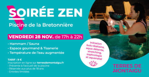 Soirée Zen – Piscine de la Bretonnière Le 28 novembre 2025 Profitez d’une soirée de détente et de bien-être dans l’eau, entre relaxation, lumière douce et ambiance zen. Piscine de la Bretonnière