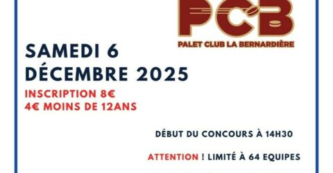 Concours de palet sur plomb par PCB (la Bernardière Le 06 décembre 2025 Le Palet Club La Bernardière (PCB) organise un concours de palets sur plomb en doublette, le samedi 6 décembre... Complexe sportif la Bernardière - commune déléguée de Cugand-la-Bernardière