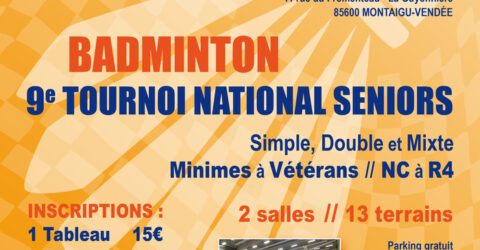 9e Tournoi National Seniors de Badminton Le 29 novembre 2025 Organisé par Badminton Club Terres de Montaigu Samedi 29 & Dimanche 30 novembre 2025 9e Tournoi National Seniors de... Pôle sportif Léonard de Vinci