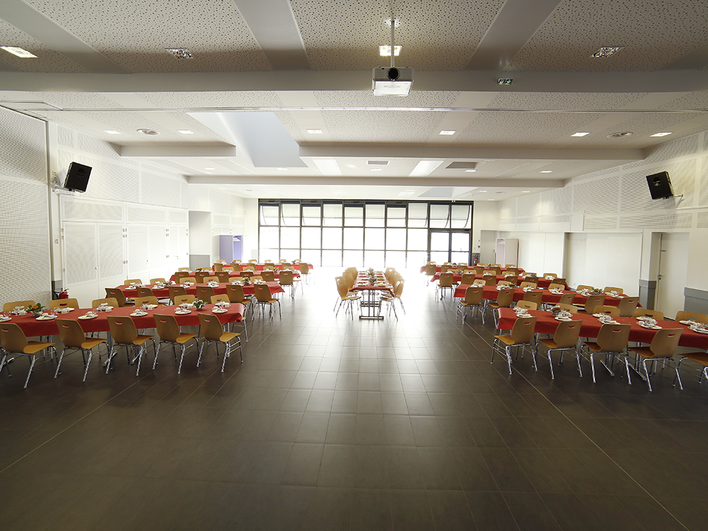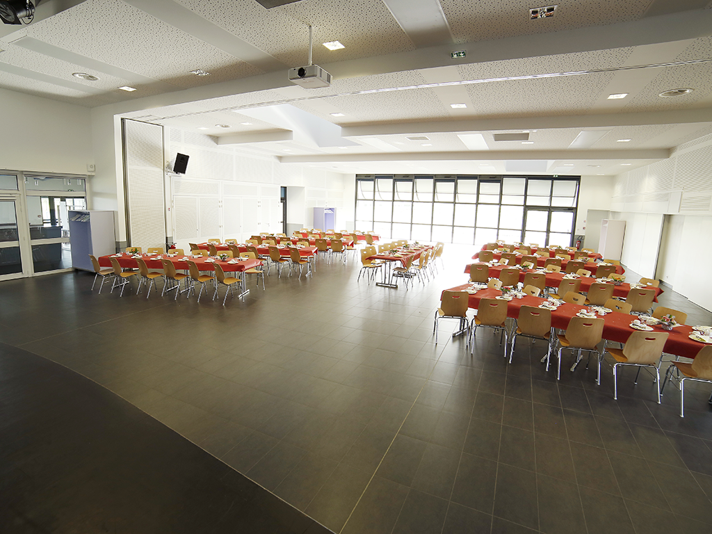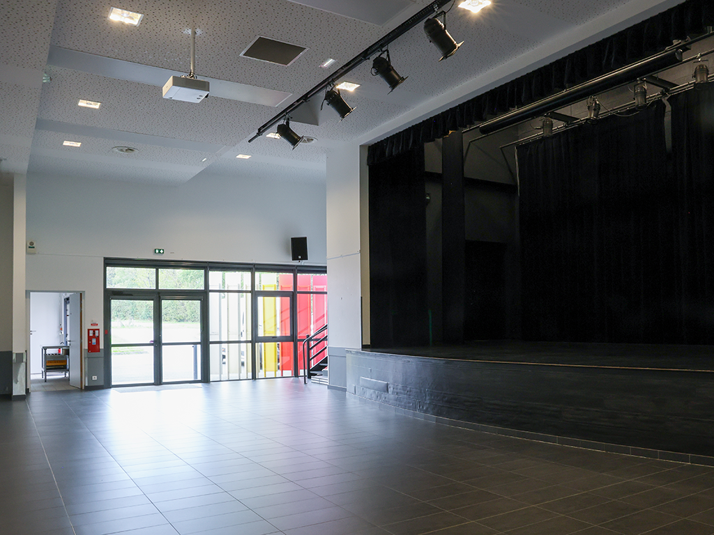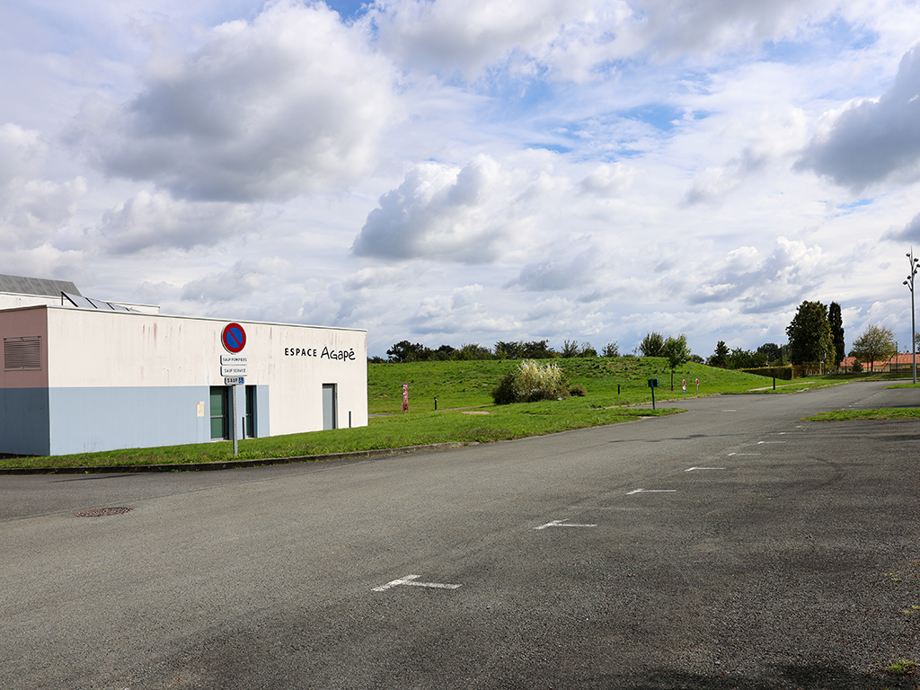 Espace Agapé – La Guyonnière L’Espace Agapé est un bâtiment pratique et modulable. Restaurant scolaire et salle polyvalente, il adapte ses dimensions en fonction des activités quotidiennes qu’il abrite, cela permet d’accueillir une large gamme de manifestations : théâtre, concerts, mariages, événements familiaux et associatifs, réunion d’entreprise… Capacité d’accueil : Debout : 400 Spectacle assis : 300 Repas assis : 260 Espaces intérieurs : Espace Hall bar Grande salle de 300 m² avec scène (10m x 5m x 5.30 haut) 2 Loges communicantes avec sanitaires et douches Espace cuisine Sanitaires Espaces extérieurs : Espace vert non clos Parking partagé avec le complexe sportif Equipements : Matériel : Vidéoprojecteur et écran 6 Enceintes (dont 2 au niveau du bar) 2 Amplis Mobilier : 50 Tables (183×76) 15 Tables (160×60) 280 Chaises Pas de Vaisselle sur place Hall/Bar 6 Portants cintres 2 Frigos de bar (125H x 75L x 40P) 1 Frigo (140H x 60L x 45P, 4 étagères) 1 Lave verres 2 Éviers Cuisine 1 Micro-onde 1 Four pro (66H x 32L x 55P, 3 grilles) 1 Piano (2 feux / plancha feu) 1 Évier 1 Lave-verres 2 Armoires frigo (135H x 60L x 70P, 3 étagères) 2 Dessertes 1 Percolateur Renseignements complémentaires : Heure d’arrêt de la musique : 2h00 Heure de fermeture : 2h30 Wi-Fi non disponible Location possible : Espaces Jauge debout Jauge assise Hall Bar 50 personnes – Hall Bar + Petite salle 80 personnes – Salle entière (Hall bar + grande salle) 400 personnes Repas : 260 personnes Spectacle : 300 personnes Localisation Rue du Stade - La Guyonnière, 85600 Montaigu-Vendée Infos utiles Service Vie associative et Gestion des salles Rue du Stade - La Guyonnière, 85600 Montaigu-Vendée 02 51 09 21 21 Nous contacter Infos pratiques Tarifs salles majeures MV 2026 Fiche technique Espace Agapé Règlement intérieur – Salles majeures