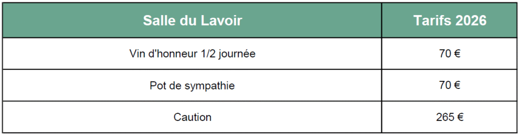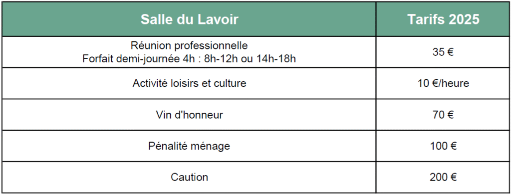 Salle du Lavoir À proximité de la Mairie déléguée de la Bernardière, la salle du lavoir est aménagée pour accueillir vos vins d’honneurs, assemblées, réunion, activités loisirs ou culturelles. Cette petite salle d’environ 40 m², prévue pour 37 personnes maximum (25 assises), est équipée d’une tisanerie. Localisation 20 Rue de la poste 85610 Cugand-la-Bernardière Infos utiles Mairie de Cugand-la-Bernardière 20 Rue de la poste 85610 Cugand-la-Bernardière 02 51 42 15 91 Nous contacter Infos pratiques Tarifs 2025 de la salle du lavoir