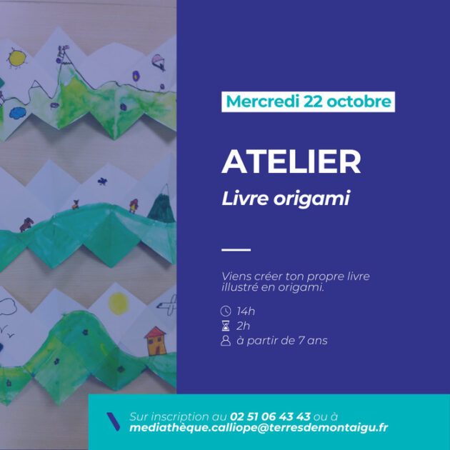 Atelier livre origami Le 22 octobre 2025 Atelier créatif à partir de 7 ans Viens créer ton propre livre illustré en origami avec la Fabrique à Livres et découvre les techniques du pliage. Public : de 7 à 12 ansÀ 14h I Durée : 2h Sur inscription Dates Le mercredi 22 octobre 2025 de 14:00 à 16:00 Complément d'informations Détails des conditions : Gratuit, sur inscription À partir de 7 Contact(s) 0251064343 mediatheque.calliope@terresdemontaigu.fr Localisation Médiathèque Calliopé Parc Henri Joyau, 85600 Montaigu-Vendée Montaigu-Vendée