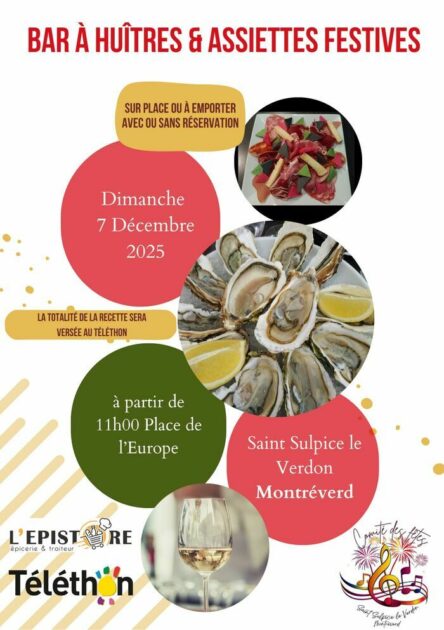 Bar à huîtres Le 07 décembre 2025 et assiettes festives Sur place ou à emporter. La totalité de la recette sera versée au Téléthon. Dates Le dimanche 07 décembre 2025 de 11:00 à 13:30 Complément d'informations Détails des conditions : Avec ou sans réservation Localisation Place de l'europe Place de l'Europe Saint Sulpice le Verdon 85260 Montréverd Saint-Sulpice-le-Verdon