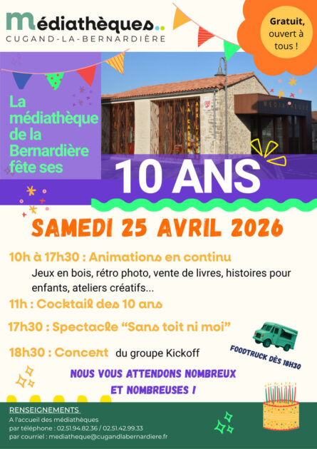 Célébrons ensemble les 10 ans de la médiathèque de la Bernardière, le samedi 25 avril 2026 de 10h à 21h