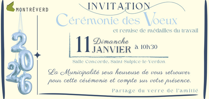 Cérémonie des vœux Le 11 janvier 2026 Cérémonie des vœux du Maire Dates Le dimanche 11 janvier 2026 de 10:30 à 11:30 Complément d'informations Détails des conditions : Ouvert à tous Contact(s) 0251428065 Localisation Salle Concorde Rue Concorde - Saint-Sulpice-le-Verdon, 85260 Montréverd Montréverd