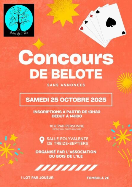 Concours de belote (sans annonces) Le 25 octobre 2025 Que vous soyez un habitué des cartes ou un joueur du dimanche, venez partager un un bon moment de détente et de jeu dans une ambiance chaleureuse et amicale ! : Inscriptions à partir de 13h30 Début du concours à 14h00 Tarif : 10 € par personne 1 lot pour chaque joueur ️ Tombola à 2 € Dates Le samedi 25 octobre 2025 de 13:30 à 22:00 Localisation Salle Polyvalente Rue Pierre Henri Gillot, 85600 Treize-Septiers Treize-Septiers