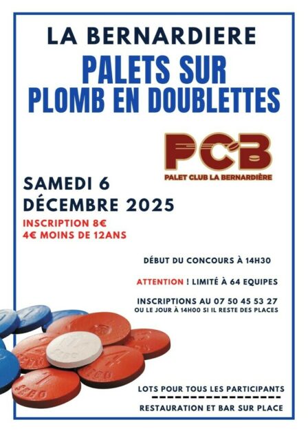 Concours de palet sur plomb par PCB (la Bernardière Le 06 décembre 2025 Le Palet Club La Bernardière (PCB) organise un concours de palets sur plomb en doublette, le samedi 6 décembre à partir de 14h30 au complexe sportif (la Bernardière) Limité à 64 équipes Dates Le samedi 06 décembre 2025 de 14:30 à 19:00 Complément d'informations Détails des conditions : 8€ (4€ pour les moins de 12 ans) Contact(s) 07 50 45 53 27 Localisation Complexe sportif la Bernardière - commune déléguée de Cugand-la-Bernardière Rue Dominger de Meyrac Cugand-la-Bernardière
