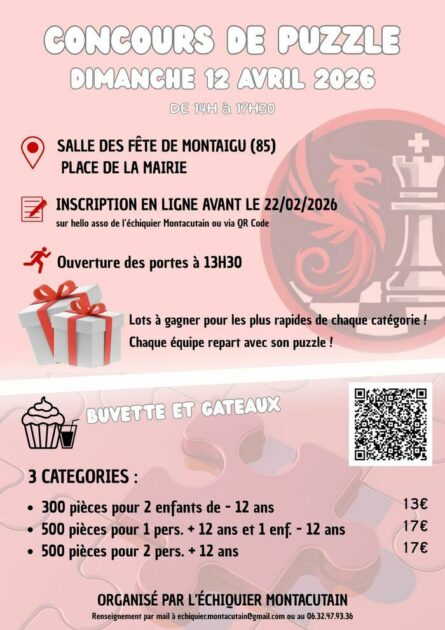 Concours de puzzle – dimanche 12 avril 2026 à Montaigu Le 12 avril 2026 Concours de puzzle – dimanche 12 avril 2026 – Salle des fêtes de Montaigu Concours de puzzle de 14h à 17h30 3 catégories : 300 pièces pour 2 enfants de – 12 ans 500 pièces pour 1 pers. + 12 ans et 1 enf. – 12 ans 500 pièces pour 2 personnes. + 12 ans Inscription en ligne avant le 22/02/2026 (voir QR code) Dates Le dimanche 12 avril 2026 de 14:00 à 17:30 Complément d'informations Détails des conditions : Sur inscription, de 13€ à 17€ Contact(s) echiquier.montacutain@gmail.com 06 32 47 93 36 Localisation Salle des Fêtes - Montaigu Place de l'Hôtel de Ville, 85600 Montaigu-Vendée Montaigu-Vendée