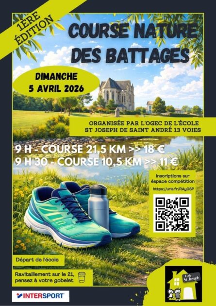 Course nature des Battages Le 05 avril 2026 Première édition Course de 21,5 km > 18 €Course de 10,5 km > 11 €Départ de l’école Saint-Joseph. Dates Le dimanche 05 avril 2026 de 09:00 à 12:00 Complément d'informations Détails des conditions : Sur inscription Contact(s) https://www.espace-competition.com/index.php?module=inscription&comp=3137 Localisation Ecole Saint-Joseph 6 rue des écoles Saint-André-Treize-Voies 85260 Montréverd Saint-André-Treize-Voies