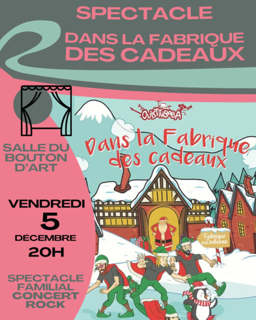 Dans la fabrique des cadeaux Le 05 décembre 2025 concert rock pour tous les âges, un spectacle familial de fin d’année! Un concert de Noël fou fou fou pour rockeurs en herbeSuivez Ouistitibaba dans une aventure déjantée !Chorégraphies loufoques, chansons décalées et mélodies entraînantes, pendant une heure les enfants sont invités à se lâcher et à se laisse remporter par la folie ouistitibabaesque !Les deux assistants du Père Noël, Cam et Léon, ont décidé de faire tomber le voile sur les mystères de la fabrique de cadeaux ! Mais, un pingouin ne l’entend pas de cette oreille et vient semer la pagaille. Qu’à cela ne tienne ! Nos intrépides héros, accompagnés de leur ami fidèle Guillaume Truc, sont bien décidés à mener leur mission à terme. Dates Le vendredi 05 décembre 2025 de 20:00 à 21:00 Complément d'informations Détails des conditions : gratuit, inscription conseillée Contact(s) mediatheque@rocheserviere.fr Localisation Salle du Bouton d'Art 23 rue des Alouettes, 85620 Rocheservière Rocheservière