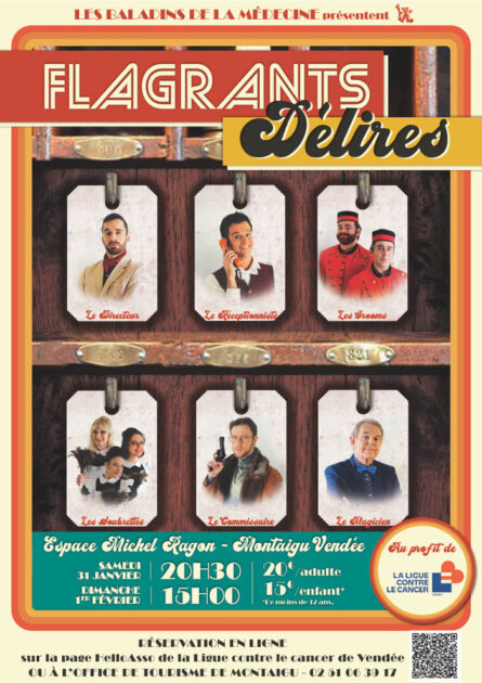 FLAGRANTS DELIRES (par les Baladins de la Médecine) Du 31 janvier 2026 au 01 février 2026 Spectacle dont les bénéfices seront versés à l’association de la Ligue contre le Cancer de Vendée Spectacle captivant et plein de rebondissements qui nous plonge dans une enquête policière délirante des années 1970. L’histoire se déroule à l’hôtel des Baladins, où un voleur de bijoux s’est réfugié.C’est un show mêlant chant, danse, jonglage, magie et humour. Un tourbillon d’émotions !]. Reservations auprès de l”Office de Tourisme à l’accueil ou par téléphone.Ou sur Hello asso Dates Le samedi 31 janvier 2026 de 20:30 à 22:30 Le dimanche 01 février 2026 de 15:00 à 17:00 Complément d'informations Détails des conditions : 20€ par adulte et 15 € pour les enfants de -12 ans Contact(s) 02 51 06 39 17 Localisation Théâtre de Thalie Cours Michel Ragon, 85600 Montaigu-Vendée Montaigu