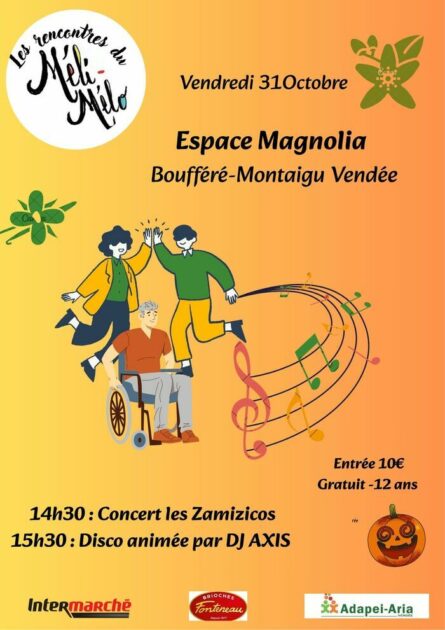 Les rencontres du Méli-Mélo vous propose une après-midi Le 31 octobre 2025 Concert et disco animée pour Halloween Vendredi 31 octobre à l’Espace Magnolias de Boufféré.Les rencontres du Méli-Mélo vous proposent :– 14h30 : Concert Les Zamizicos– 15h30 : Disco animée par DJ AXISL’entrée est à 10 € et gratuite pour les moins de 12 ans. Dates Le vendredi 31 octobre 2025 de 14:30 à 17:00 Complément d'informations Détails des conditions : Entrée 10€ et gratuite pour les moins de 12 ans. Localisation Espace Magnolias 2 rue du stade boufféré Montaigu-Vendée