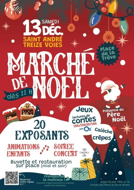 Marché de Noël Le 13 décembre 2025 Animations et exposants Présence du Père-Noël.Nombreux exposants, animations, lecture de conte, promenade en calèche…Buvette et restauration sur place (midi et soir)Soirée concert. Dates Le samedi 13 décembre 2025 de 11:00 à 20:00 Complément d'informations Détails des conditions : Réservation des repas en ligne Contact(s) https://www.helloasso.com/associations/comite-des-fetes-st-andre-treize-voies/evenements/marche-de-noel-2025 Localisation Place de la Trêve Rue du Petit Saint-André - Saint-André-Treize-Voies, 85260 Montréverd Montréverd