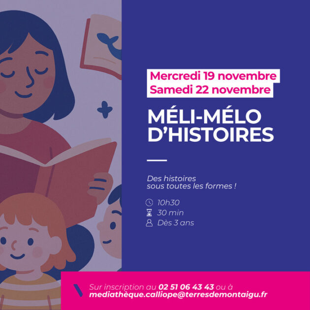 Méli-mélo d’histoires Le 19 novembre 2025 Des histoires sous toutes les formes, livre, kamishibaï, raconte tapis, tout est permis ! Des histoires sous toutes les formes (livre, kamishibaï, raconte tapis, tout est permis !) Public : dès 3 ansÀ 10h30 I Durée : 30 min. Dates Le mercredi 19 novembre 2025 de 10:30 à 11:00 Le samedi 22 novembre 2025 de 10:30 à 11:00 Complément d'informations Détails des conditions : Sur inscription À partir de 3 Contact(s) 02 51 06 43 43 mediatheque.calliope@terresdemontaigu.fr Localisation Médiathèque Calliopé Parc Henri Joyau, Avenue Villebois Mareuil, 85600 Montaigu-Vendée Montaigu-Vendée