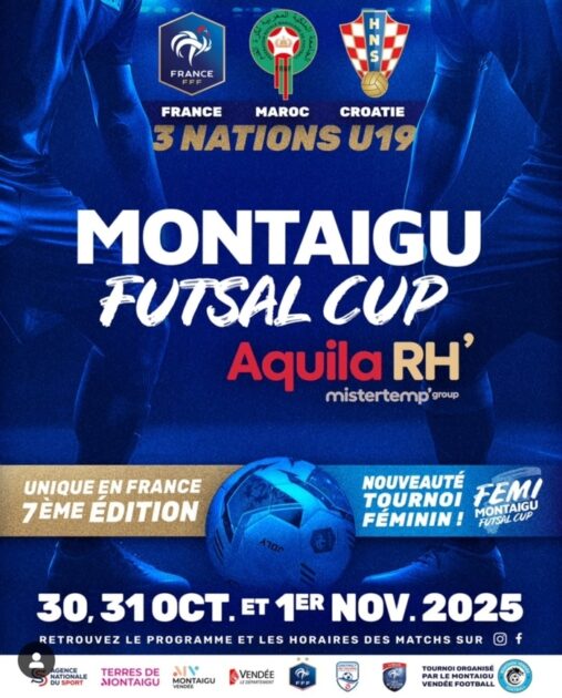 Montaigu Vendée Futsal – 7ème Futsal Cup Du 30 octobre 2025 au 01 novembre 2025 Le MVF organise son tournoi de futsal du 30 octobre au 1er novembre. La grande nouveauté de cette 7ème édition est l’organisation, en parallèle du tournoi U19 masculin, d’une nouvelle compétition :La . Ce tournoi féminin de niveau national regroupera 3 des meilleures équipes du moment et plusieurs joueuses internationales Voici le programme : . Jeudi 30/10 :19h00 : CROATIE-MAROC. Vendredi 31/10 :19h00 : FRANCE-CROATIE. Samedi 01/11 :19h00 FRANCE-MAROC Lieu : Pôle Sportif Maxime BossisEntrée payante le vendredi soir et samedi après-midi.Restauration sur placeEspace Partenaires Dates Le jeudi 30 octobre 2025 de 19:00 à 23:59 Le vendredi 31 octobre 2025 de 19:00 à 23:59 Le samedi 01 novembre 2025 de 19:00 à 23:59 Complément d'informations Détails des conditions : Entrée payante Localisation Pôle sportif Maxime Bossis Rue du Mondial - Saint-Hilaire-de-Loulay, 85600 Montaigu-Vendée Montaigu-Vendée