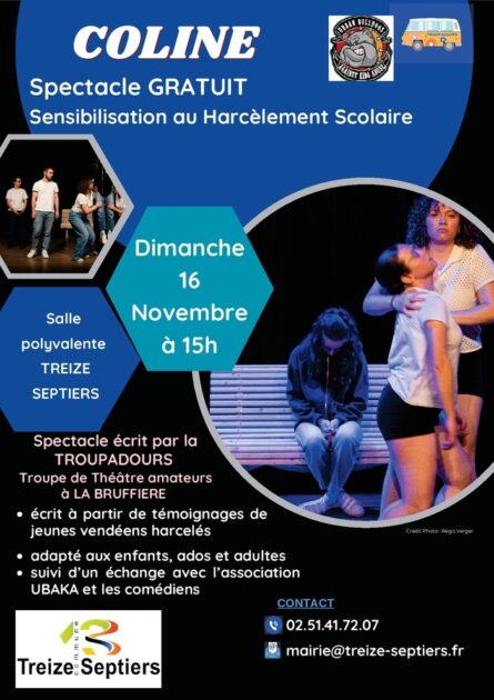 Pièce de théâtre “Coline” Le 16 novembre 2025 Venez assister au spectacle « », une pièce de théâtre sur la sensibilisation au harcèlement scolaire, une création de la troupe de théâtre amateur “Les Troupadours” de La Bruffière Un é , écrit à partir de témoignages de jeunes vendéens victimes de è , et é à : enfants, ados et adultes.L’occasion de réfléchir, d’échanger et de mieux comprendre les conséquences du harcèlement scolaire.La représentation sera ’ ’é avec l’association UBAKA (Urban Bulldogs Against Kids Abuse), un groupe de motards solidaires qui parcourent les routes pour protéger, soutenir et redonner confiance aux enfants victimes de harcèlement.Venez nombreux partager ce moment de théâtre et de sensibilisation. Dates Le dimanche 16 novembre 2025 de 15:00 à 18:00 Complément d'informations Détails des conditions : Gratuit Localisation Salle polyvalente Treize-Septiers 2, rue Pierre Henri Gillot, 85600 Treize-Septiers Treize-Septiers