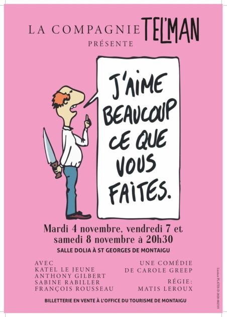 Pièce théâtre Le 04 novembre 2025 La compagnie Tel’Man présente “J’aime beaucoup ce que vous faites ” les 4, 7 et 8 novembre 2025 à 20h30, salle Dolia à Saint-Georges-de-Montaigu MONTAIGU-VENDEE. Dates Le mardi 04 novembre 2025 de 20:30 à 23:00 Le vendredi 07 novembre 2025 de 20:30 à 23:00 Le samedi 08 novembre 2025 de 20:30 à 23:00 Contact(s) 02 51 06 39 17 Localisation Salle Dolia, Montaigu Vendée (Saint-Georges-de-Montaigu) Chassereau Saint-Georges-de-Montaigu, 85600 Montaigu-Vendée