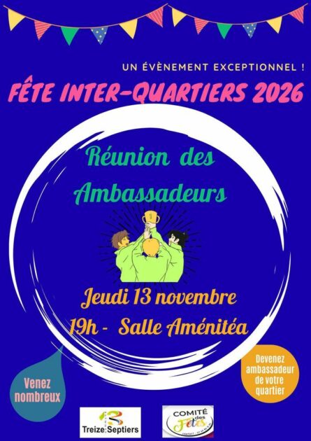 Réunion des Ambassadeurs Le 13 novembre 2025 Vous aimez la vie de votre quartier ? Vous avez envie de participer à la préparation de la Fête Inter-quartier 2026 ? Venez être ambassadeur lors de la fête inter-quartier 2026. ê – ! Habitants de tous les quartiers, préparez-vous… Cette année, la fête interquartiers qui se déroulera le sera placée sous le signe du défi amical entre quartiers ! Pour représenter votre quartier, il vous faut : des voisins motivés, fédérateurs, prêts à porter haut les couleurs de leur rue, lotissement ou résidence ! Rejoignez-nous pour découvrir le rôle des Ambassadeurs : représenter votre quartier, partager vos idées et contribuer à une fête conviviale ℝÉ ℕ ℕ ‘ ℕ ℝ ℕ é é ️ 13 à 19 00 à é Ensemble, faisons de cet événement un moment fort de notre commune ! Dates Le jeudi 13 novembre 2025 de 19:00 à 20:30 Complément d'informations Détails des conditions : Entrée libre Localisation Salle Aménitéa 85600 TREIZE-SEPTIERS Treize-Septiers