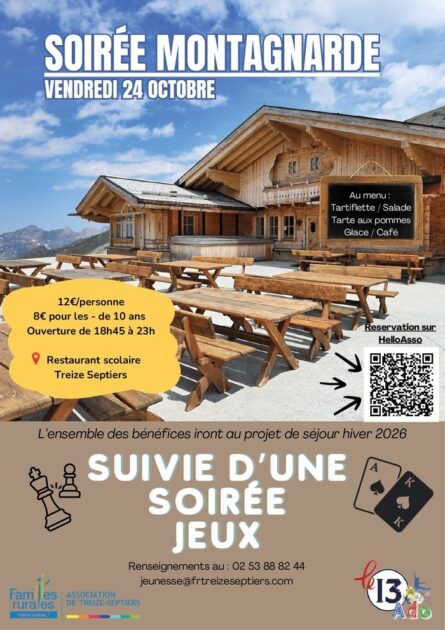 Soirée Montagnarde Le 24 octobre 2025 Soirée conviviale au profit du séjour hiver 2026 organisé avec et pour les jeunes de l’association “Le 13 ADO”❄️⛷️. Tous les bénéfices financeront une partie de leur projet à la montagne. Dates Le vendredi 24 octobre 2025 de 18:45 à 23:00 Complément d'informations Détails des conditions : Sur inscription. 12€/ personne - 8€ pour les - de 10 ans Contact(s) https://www.helloasso.com/associations/familles-rurales-treize-septiers/evenements/soiree-montagnarde-1 Localisation Restaurant scolaire 3 Rue du Menhir, 85600 Treize-Septiers Treize-Septiers