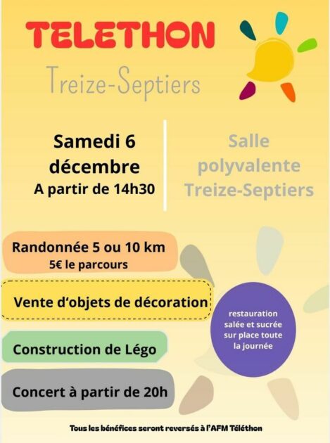 Téléthon 2025 Le 06 décembre 2025 Rejoignez-nous pour le Téléthon 2025 Nombreuses animations : Randonnée de 5 ou 10 km Vente d’objets de décoration Construction de Lego Concert à partir de 20h00 Dates Le samedi 06 décembre 2025 de 14:30 à 23:59 Localisation Salle polyvalente Treize-Septiers 2, rue Pierre Henri Gillot, 85600 Treize-Septiers Treize-Septiers