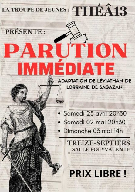 Théâtre “Parution immédiate” Du 25 avril 2026 au 03 mai 2026 La nouvelle troupe de théâtre des ados ” éâ ” est heureuse de vous présenter sa première pièce ” é “. Dates Le samedi 25 avril 2026 de 20:30 à 22:30 Le samedi 02 mai 2026 de 20:30 à 23:00 Le dimanche 03 mai 2026 de 14:00 à 16:30 Complément d'informations Détails des conditions : Prix libre Localisation Salle polyvalente Treize-Septiers 2, rue Pierre Henri Gillot, 85600 Treize-Septiers Treize-Septiers