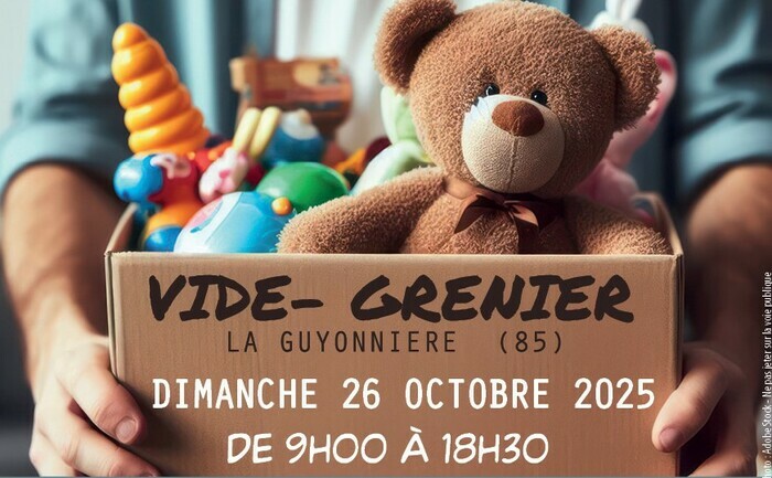 Vide-grenier – Dimanche 26 octobre 2025 – La Guyonnière Le 26 octobre 2025 Vide-grenier – Dimanche 26 octobre 2025 – La Guyonnière Dates Le dimanche 26 octobre 2025 de 09:00 à 18:30 Localisation Salle de sports André Chevalier Rue des Agapes - La Guyonnière, 85600 Montaigu-Vendée Montaigu-Vendée